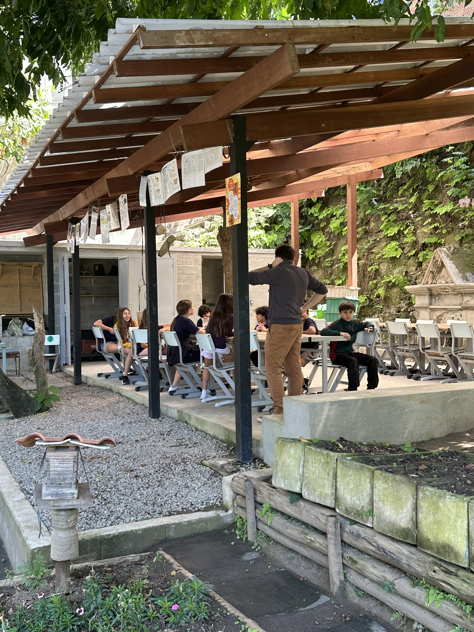 Mais l’essence du projet réside surtout dans sa dimension pédagogique. Beaucoup d’activités sont organisées autour de la horta, intégrant biologie, chimie, agroécologie, gastronomie et éducation environnementale. Les enfants découvrent la biodiversité, développent de bonnes habitudes alimentaires et réalisent des projets concrets comme l’inventaire de la faune et de la flore du lycée, ou encore la production de plants natifs pour reforestation. Une nouvelle salle de classe ouverte a vu le jour en 2024, ce qui permet à nos élèves d’apprendre tout en étant connectés à la nature qui les entourre.